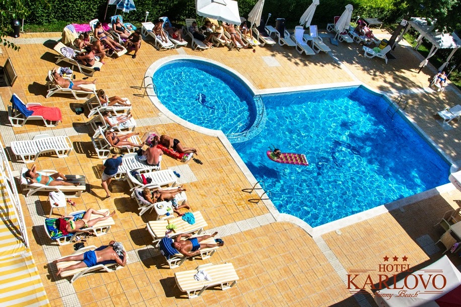 Hotel “Karlovo” *** Локација: у централном делу Сунчаног Брега, око 200 метара од плаже, 20 метара од главне улице, поред банке, аутобуске станице, болнице, полиције, бизнис центра, супермаркета, воденог парка.Комплетно реновиран и модернизован у 2011 години. Поседује 5 спратова, број соба - 28 двокреветних соба са помоћним лежајем, 12 трокреветних са помоћним лежајем, 4 апартмана (2 + 2), 21 апартмана са кухињом (4 + 1).У соби: два /три редовни кревети, помоћни лежај, клима, ЛЦД ТВ-САТ, мини бар (фрижидер), телефон, купатило са туш кабином, феном, балкон. У апартманима (2+2): Апартмани се састоје од две одвојене собе са прикључним вратима. У спаваћој соби - брачни кревет, ЛЦД ТВ-сателит, ормар, балкон. У дневној соби - кауч и фотеља, ормар, ЛЦД ТВ-сателит, телефон, купатило са туш кабином, феном, балкон.Апартмани са чајном кухињом: састоје се од улазног ходника, двије спаваће собе, кухиње са фрижидером, микроталасном пећу, чајником за воду, и прибор за јело. Капацитет: четири лежаја и кревет на развлачење (или кревет). Свака соба има ЛЦД телевизор, клима уређај, ормар, балкон, купатило са туш кабином.Имајте на уму да кухиња нема шпорет и пећ за кување!На територији хотела: рецепција, базен, дечији базен, ресторан са летњом баштом, лоби бар, бар поред базена, играоница са билијаром, стони фудбал, и још много тога. Аиурведа масажа, соба за пртљаг, дечији клуб, игралиште, лифт, обезбеђење, WiFi интернет поред рецепције, у лоби, у ресторану.Ресторан нуди доручак и ручак на бази щведског стола.